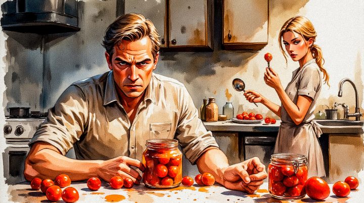 Василий замер на месте, повернулся в сторону банки помидоров и нахмурился.